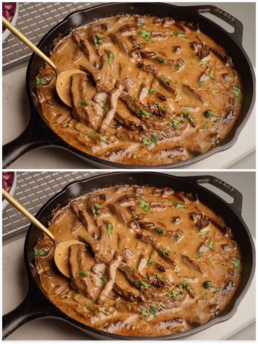Den kombinerer mørt biffkjøtt, sopp, løk og en kremet, smakfull saus laget med tomat og fløte.