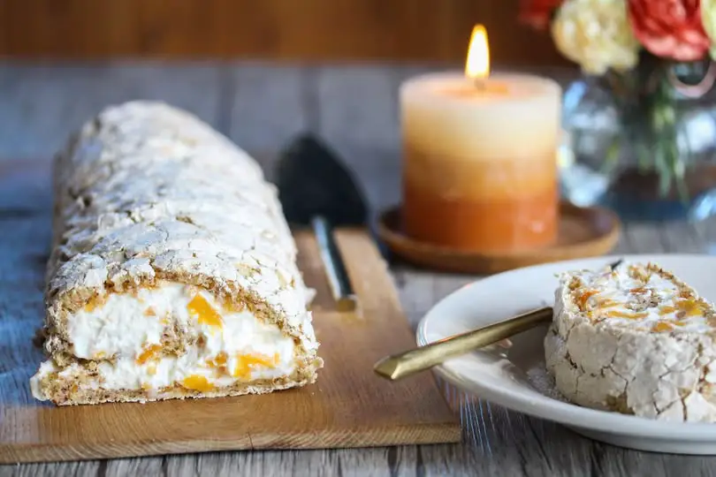 Denne svenske klassikeren – Budapest-rullekake – er en himmelsk kombinasjon av sprø nøttebunn, myk krem og søt frukt. 🍊☁️