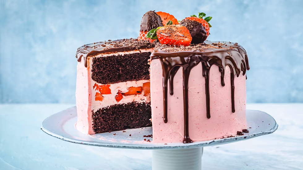 En drip cake med sjokolade og jordbær er den ultimate festkaken for enhver anledning.