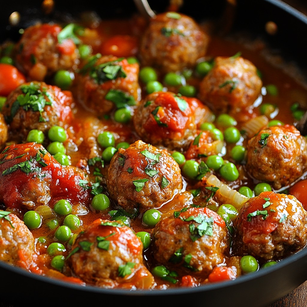 Disse oksekjøttbollene kokt med erter og tomater er en fyldig og smakfull rett som kombinerer saftige kjøttboller med en rik tomatsaus og myke grønne erter.