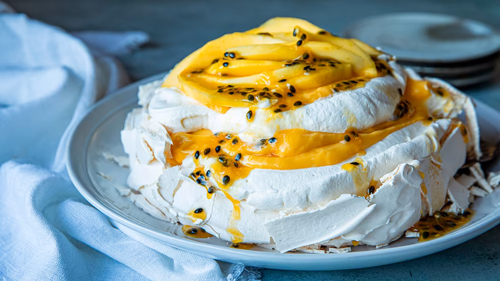 Denne pavlovaen med pasjonsfruktkrem og mango er en tropisk drøm av en dessert – søt, syrlig, sprø og silkemyk på samme tid.