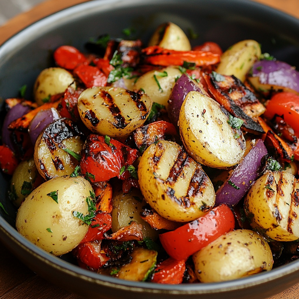 Den kombinerer milde, møre poteter med sødmen fra grillede grønnsaker og frisk sitrondressing – en perfekt balanse av smak og tekstur.
