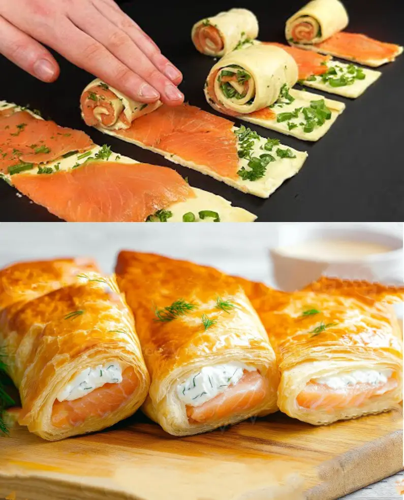 Røkt lakseruller i butterdeig er en enkel, men elegant rett som kombinerer sprø butterdeig, kremet fyll og salt røkelaks.